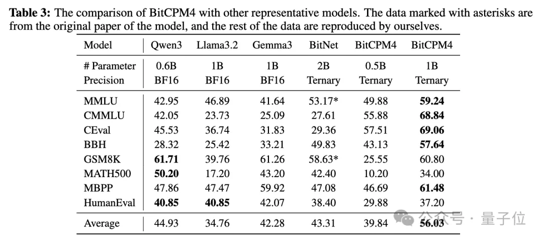 实验结果显示,在0.5B参数级别,BitCPM4-0.5B在知识相关任务上表现优异,超过了Qwen3 0.6B全精模型;在1B参数级别,BitCPM4-1B的性能与2B参数模型相当。