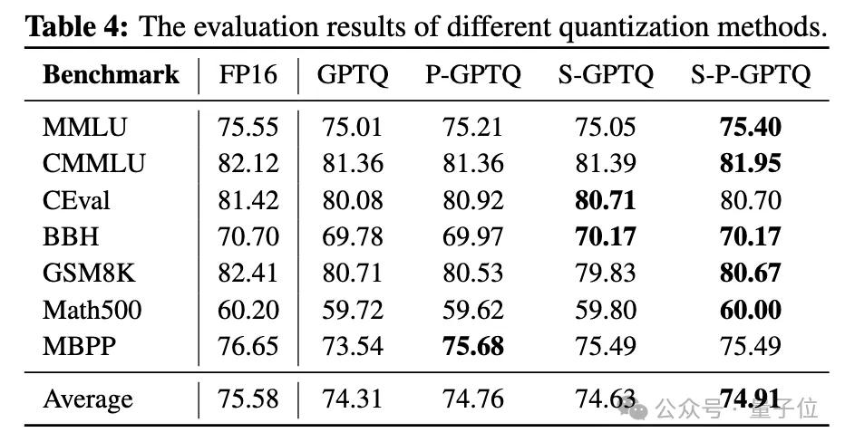 实验结果表明,在INT4量化设置下,P-GPTQ相比其他量化方法取得了最优性能,显著减少了相对于FP16基线的性能退化。