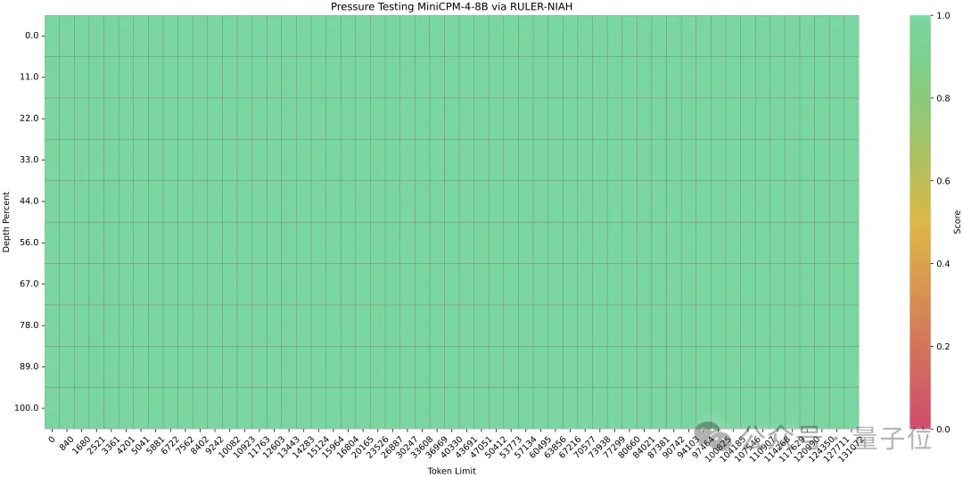 长序列处理能力强:MiniCPM4在长序列上能够取得令人满意的性能,在大海捞针任务上达到100%的准确率。并且对于每个词元,MiniCPM4只需要模型关注6K上下文词元,这意味着在128K上下文中,MiniCPM4的稀疏度仅为 5%。