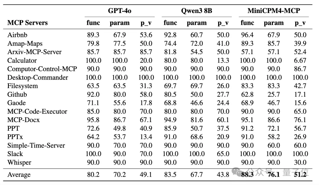 在人工标注测试集上的评测结果显示,MiniCPM4-MCP在函数名称、参数名和参数值填充准确率方面全面优于 Qwen3-8B,并在多个服务器上逼近甚至超越GPT-4o,证明其具备通用、多样的工具调用能力,是构建智能体系统的理想基础模型。