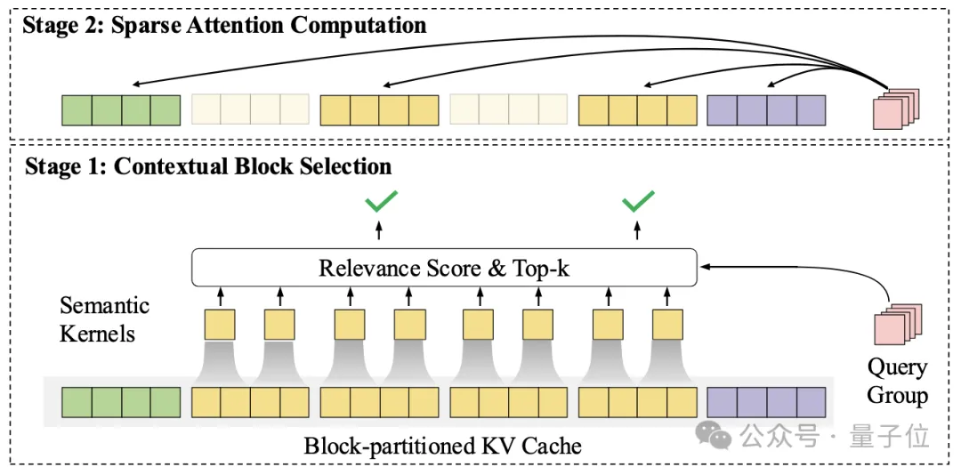 注意力层进行计算之前,对每个查询词元逐块地进行上下文相关性计算,并选取少量最相关的上下文块参与最终的注意力计算。即实现了注意力层的智能化选择机制,只对最有相关性的重点区域进行注意力计算“抽查”。