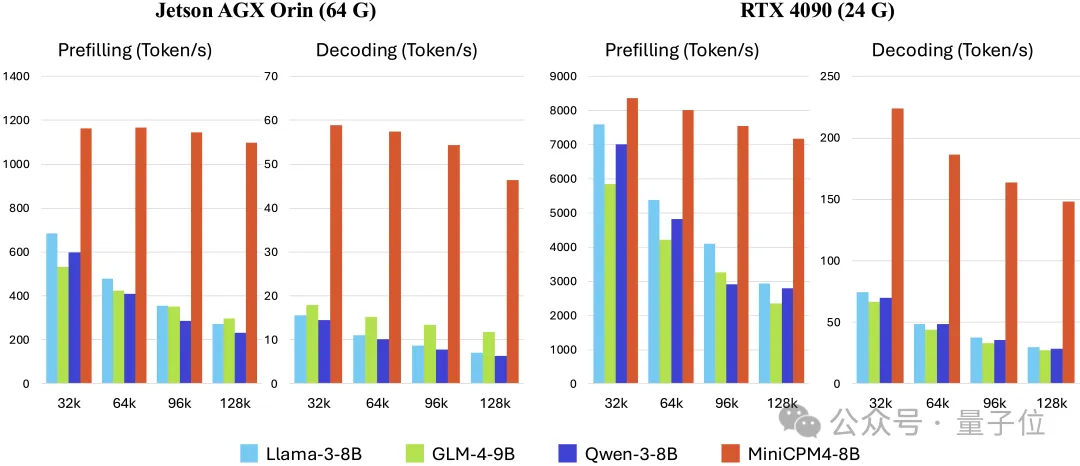 评测结果如图所示。团队评测了 Llama3-8B、GLM4-9B、Qwen3-8B和MiniCPM4在32K到128K序列上的吞吐速度。