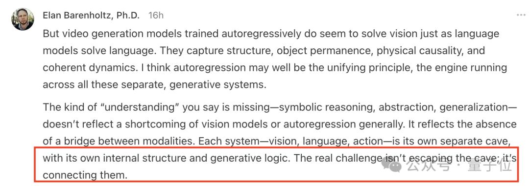 对此,有评论者提出:视觉、语言、行动系统就像独立的洞穴,如果能够通过共享结构建立桥梁,可能就不需要逃离“洞穴”,跨模态连接就成了探索过程中的挑战,需要找到一个连接这些模态的统一的方法。