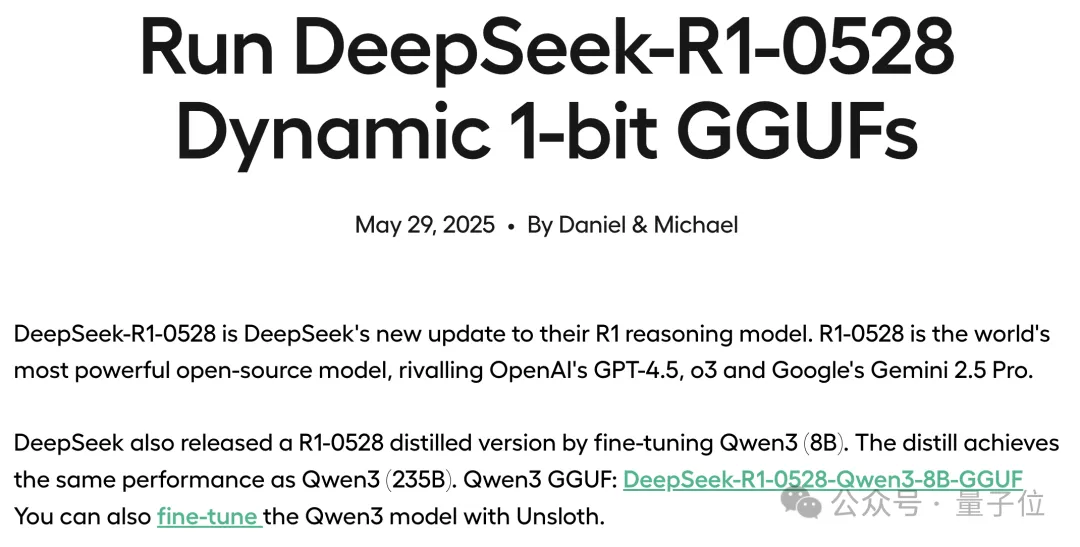 另外Unsloth这次还推出了用R1-0528蒸馏的Qwen3-8B模型,据介绍可以达到与Qwen3-235B相同的性能,并且“几乎可以适应任何配置”。