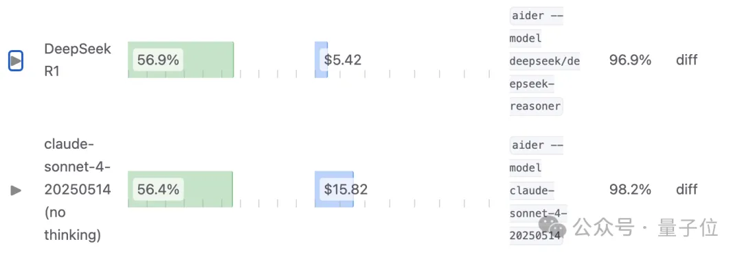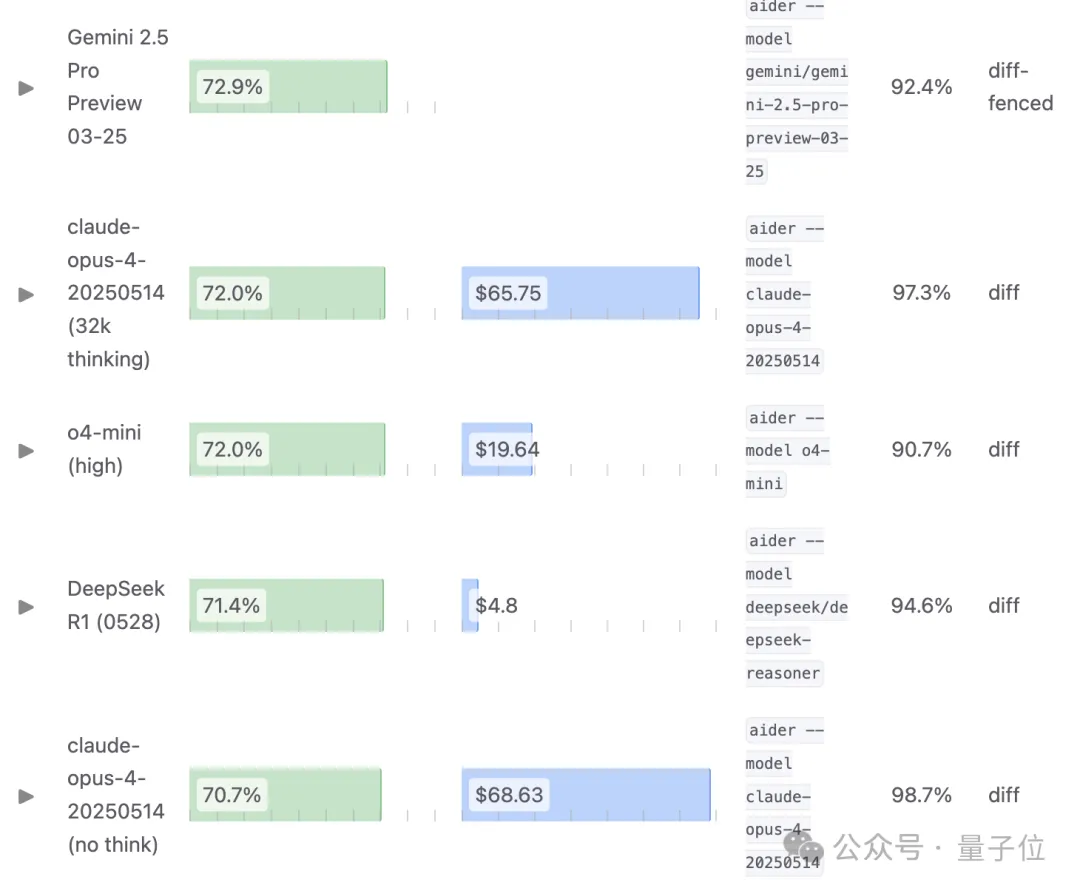 而R1-0528的满血版在aider上则是取得了71.4分,超过了不开启思考的Claude 4 Opus。