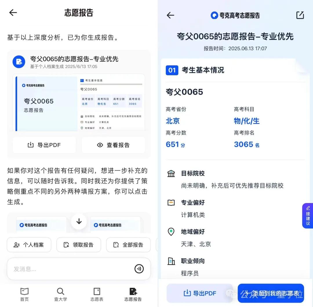 它就是夸克最新发布的国内首个高考志愿大模型,5+分钟就能生成一份完整的志愿报告: