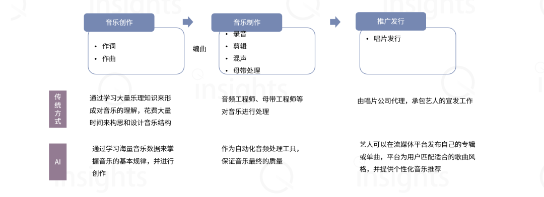 此外,AI对于音乐产业的一大变革在于音乐制作流程的极大简化。原先不同步骤的工序需要不同的人/团队来完成。AI出现后,一个人可以完成所有工序。其中,生成式AI更多运用在创作部分,在制作和发行流程中,也会加入其他AI技术。本报告主要聚焦于生成式AI对音乐产业中部分环节的变革。