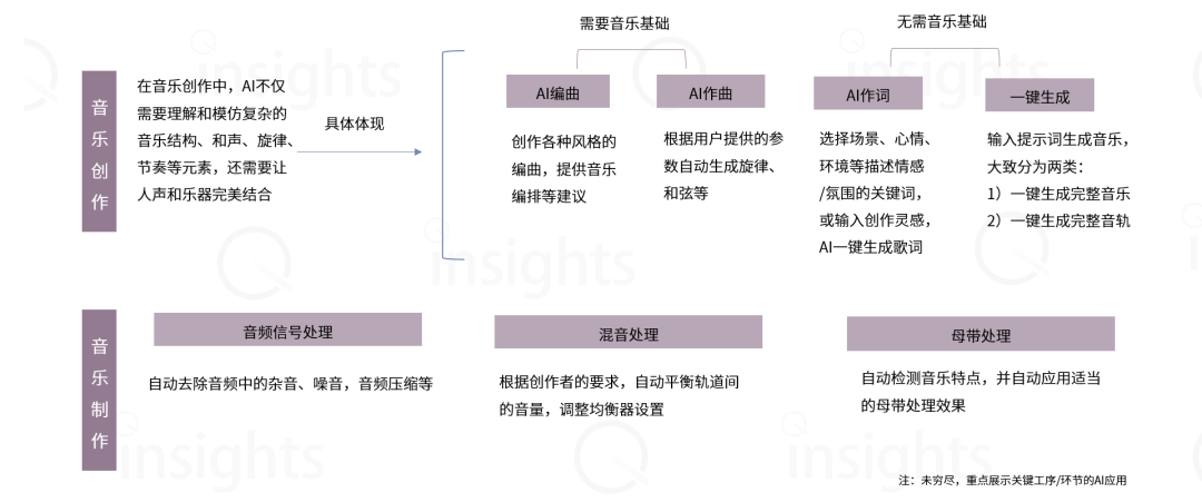 量子位智库将AI创作分为一键生成、AI作曲和AI作词三类,并以此绘制了AI音乐产业图谱。