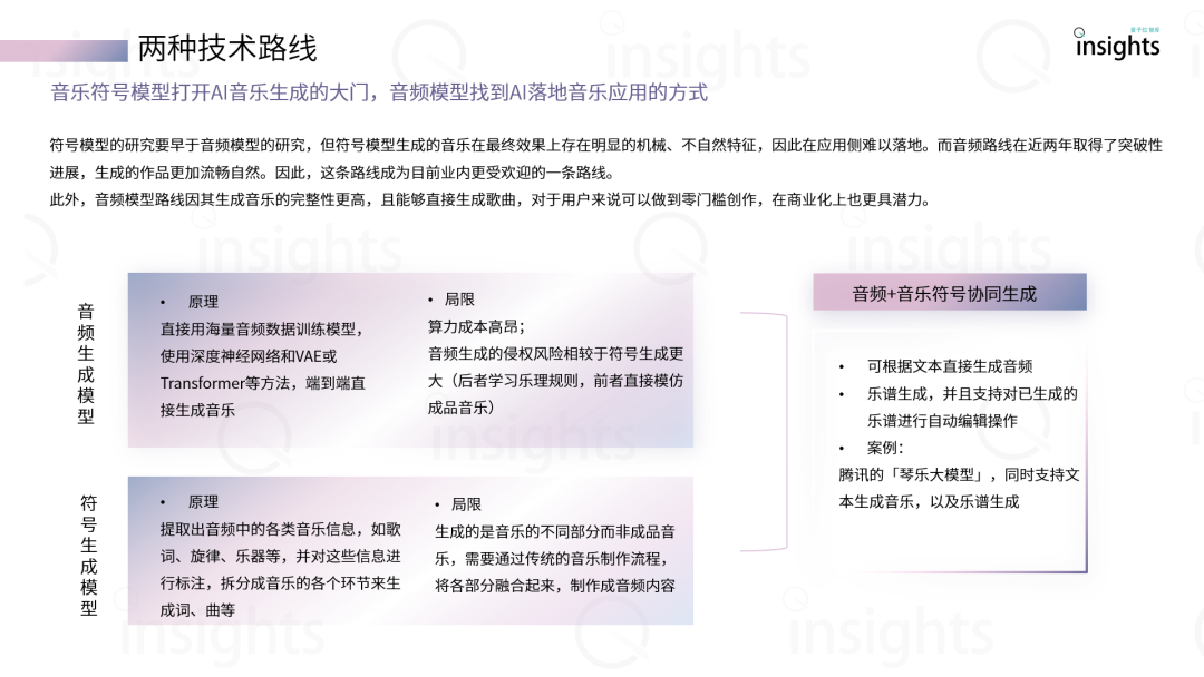 有了基本操作流程后,需要明确具体的技术路线。在音乐生成领域,目前有两种主流技术路线,音频生成和符号生成。