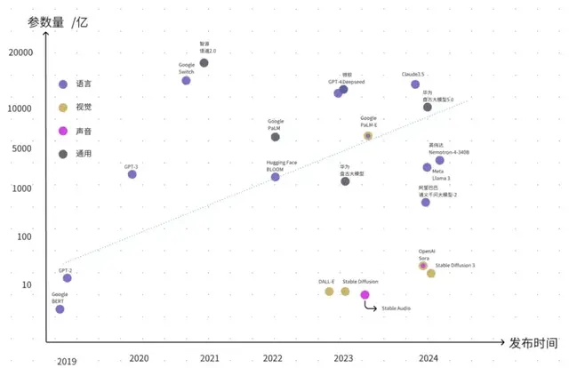 根据图上来看,从2019年至今,大模型进入军备竞赛。尺寸规模不断扩张。