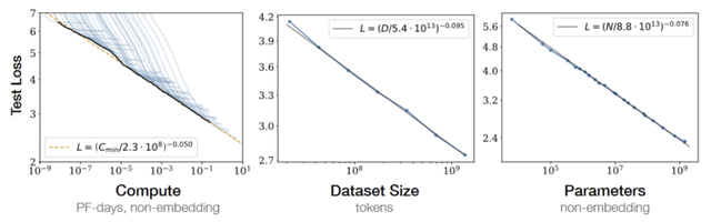 尺度定律指的是,以Transformer架构为研究目标的模型的性能和模型的大小,数据集的大小以及用于训练的计算量之间存在幂律关系,并且这些关系在7个数量级的范围内表现出稳定的趋势。