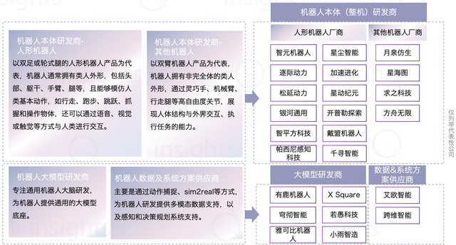 具身智能创业公司可分为机器人本体(整机)研发商、机器人大模型研发商和机器人数据及系统方案供应商。