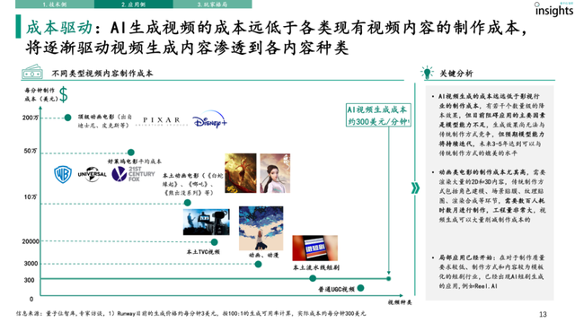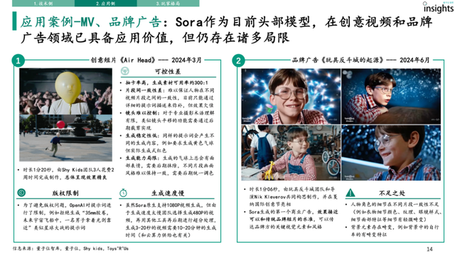 就各类视频内容而言,视频生成已经可以实现不同幅度的成本削减,对于通用的文生视频、图生视频功能,目前已经可以看到少量的应用案例。但整体而言应用仍处在早期阶段。目前主要的制约因素依然是模型能力,生成效果和可控性难以满足商用需求,且需要专业的提示词交互能力以及相应的后期处理。但我们预期模型能力将持续提升,相关产品、交互形式将更加完善,可控性将在模型层和产品层两个方面得到提升。