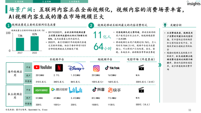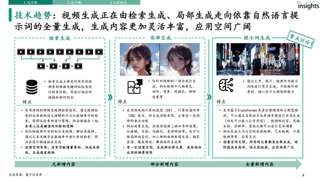 - 视频生成技术正在从检索生成、局部生成走向基于提示词的全量生成