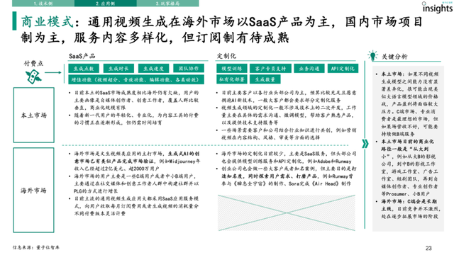 垂类创业公司:目前垂类创业公司的场景主要在视频营销领域,可以快速实现商业化落地,客户主要以各类商家为主。模型层和主流讨论的文生视频差异较大,不追求通用化、创意化的生成效果,主要强调在营销场景下的可控性和稳定性,并针对此类功能做专项的模型增强。另外技术上不一定需要走生成式AI的路线(基于扩散模型、Transformer),基于多模态机器学习、素材的检索生成组合也在很多场景下更能满足需求,但生成式AI可作为素材补充。垂类创业公司和核心优势在于对于营销业务的理解,包括营销视频ROI最大化,跨平台运营以及垂类场景的数据等,对行业knowhow有较高要求。