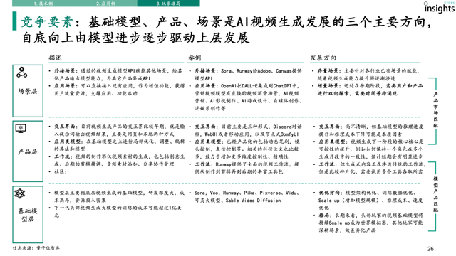 从模型层来看:各家的竞争力取决于规模和投入度,互联网公司、技术创业公司及内容工具平台的头部玩家在模型层基本处于相近水平,例如谷歌Veo,Runway Gen-3,快手可灵,预计Adobe的Firefly(视频模型正在研发中)以及Midjourney(视频模型正在研发中)也会达到类似水平。竞争格局上看,考虑到1)内容生成的多样性需求、文化差异,2)类似语言模型格局,B端会保留多个选择,3)但视频基础模型的的进入门槛高(算力、数据、人才等),基础模型层不会一家独大,但也不会过于碎片,海外和本土可能各有数家基础模型提供商占据市场的大部分份额。对于内容软件和垂类创业公司,基础模型对于多数内容工具软件和垂类创业公司并不是核心业务,主要还是业务导向匹配用户需求,愿意在自己的软件中外接其他模型或者使用微调后的模型,数据基础模型进步的受益方,不会在基础模型层和大公司和专业公司竞争。