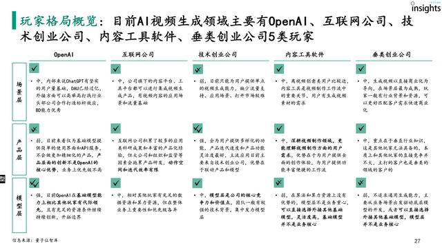 目前视频生成领域主要有5类玩家,包括OpenAI、互联网公司、技术创业公司、内容工具软件以及垂类创业公司。