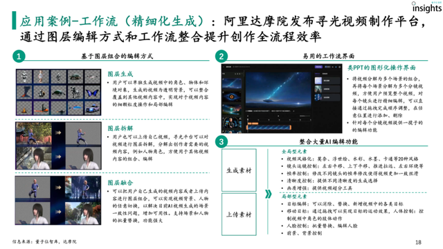 我们认为未来视频生成的普及需要在工作流层面的创新和成熟。现阶段AI视频的工作流比较碎片化,需要在多个应用之间穿插,创作摩擦较大,例如先在Midhourney生成指导图,再使用视频应用的图生视频功能,再进行后期的剪辑和配音。未来视频生成领域在工作流层面的创新将主要包括两个方向,一是精细化生成,可以对视频中各类细节进行控制,二是流程化整合,以减少创作的摩擦和阻力,通过一站式服务提高效率。目前市场上已有一些相关方向的尝试,但受限于基础模型模型的能力,整体生成效果依然欠佳,但我们预计随着模型能力的进步局限性将逐步缓解。