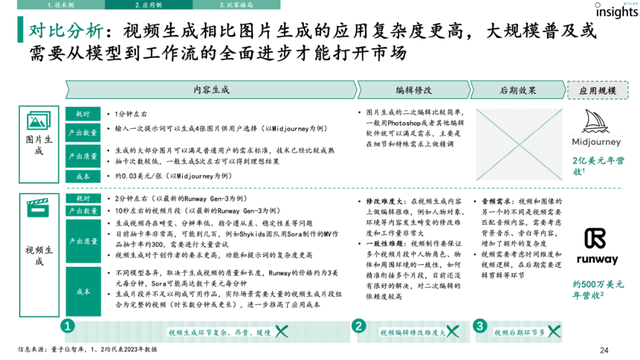 从场景层来看:除垂类创业公司以外,其他玩家都未找到明确的应用场景,大多在实验和探索阶段,C端主要还是一些Prosumer(专业创作者)比如自媒体创作者、艺术家等,B端客户由于模型效果差、可控性弱、和技术接受度等原因渗透较少,只有少量单点的案例。大场景或PMF的确认可能需要等待模型能力进步、产品的打磨、和推理成本的下降,需要一段时间的摸索。