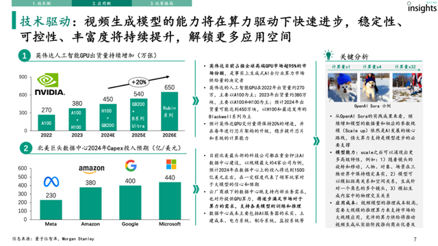 在训练侧,视频大模型的进步同样遵循Scaling Law,需要在Scalable的模型架构上不断增加数据和算力来提升模型能力。在推理侧,需要算力成本的下降和充足的供给来支撑下游的应用和商业化。我们正在看到GPU的性能提升和领军玩家在算力基建上的巨额投入,这将成为未来视频模型发展和应用的根本驱动力。