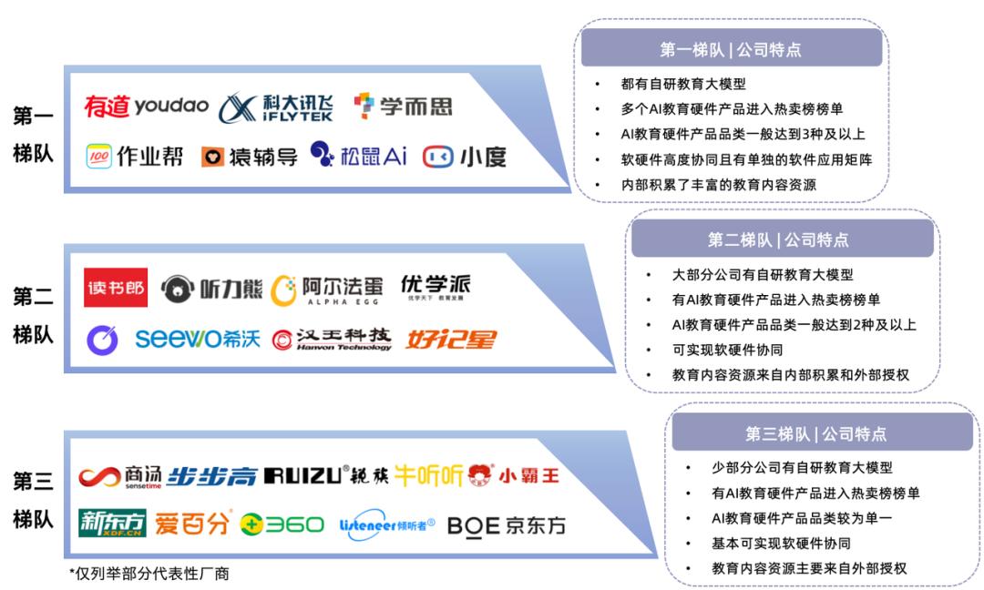 消费级AI教育硬件市场中,不同类型、不同背景的厂商各有优势,可依据综合竞争力分析标准将头部代表性玩家们进行梯队划分。