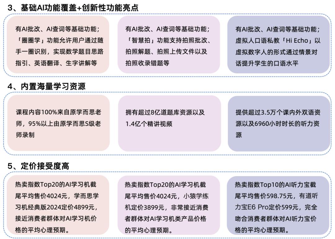 AI教育硬件的功能也日益丰富,从AI查词与翻译,到AI作文批改和AI口语陪练等,满足用户不同场景的学习需求;