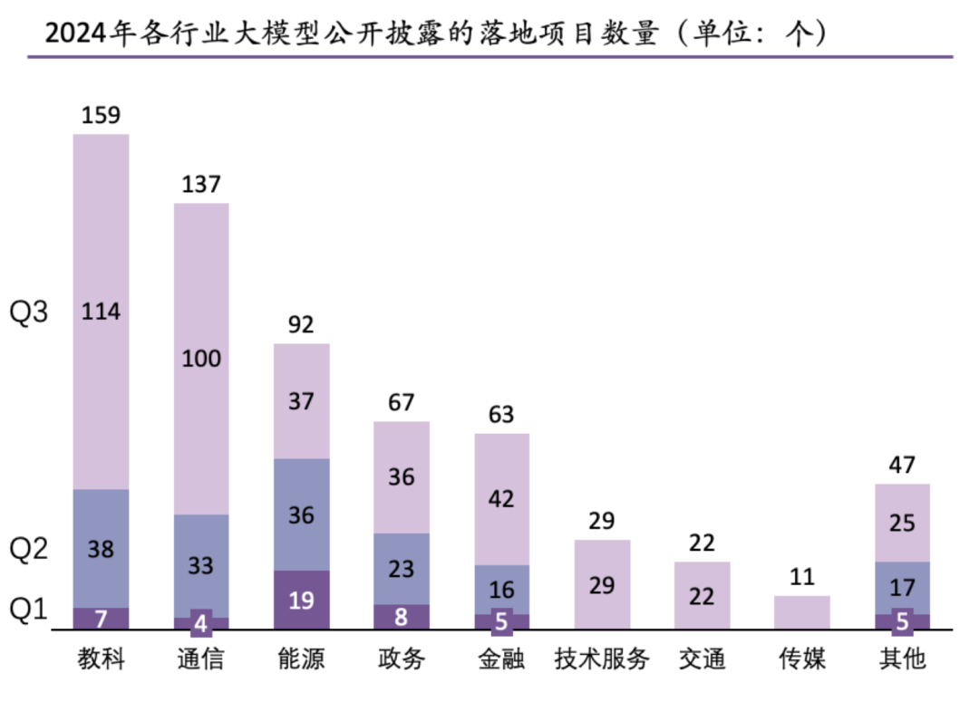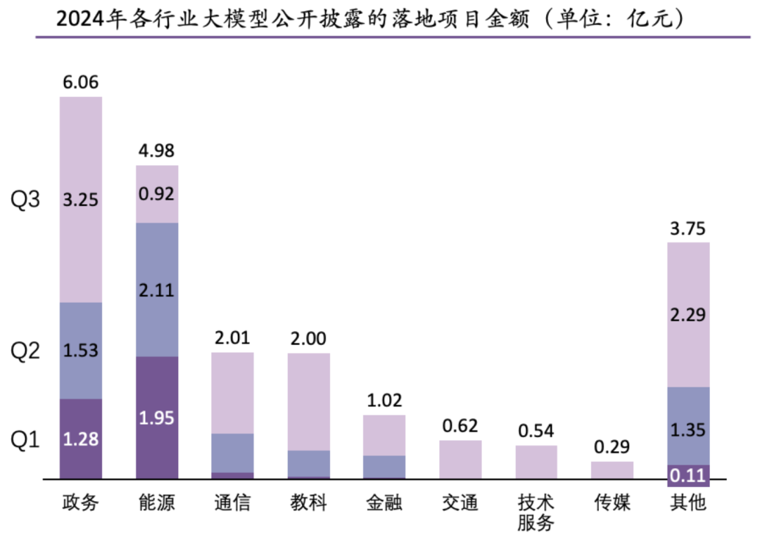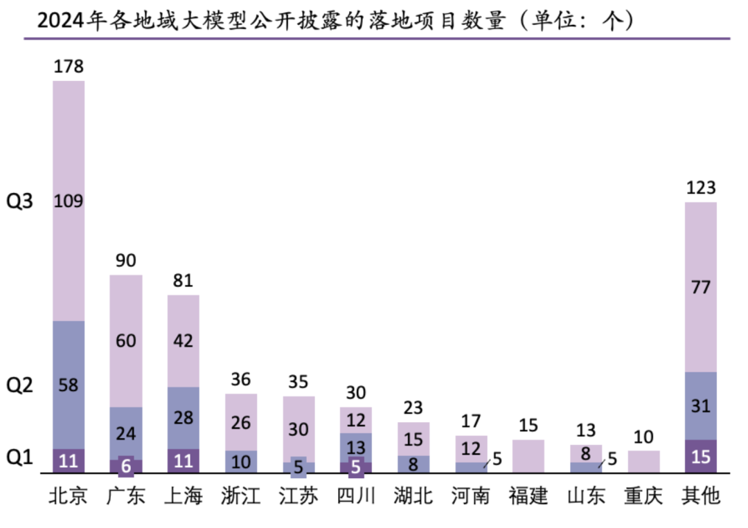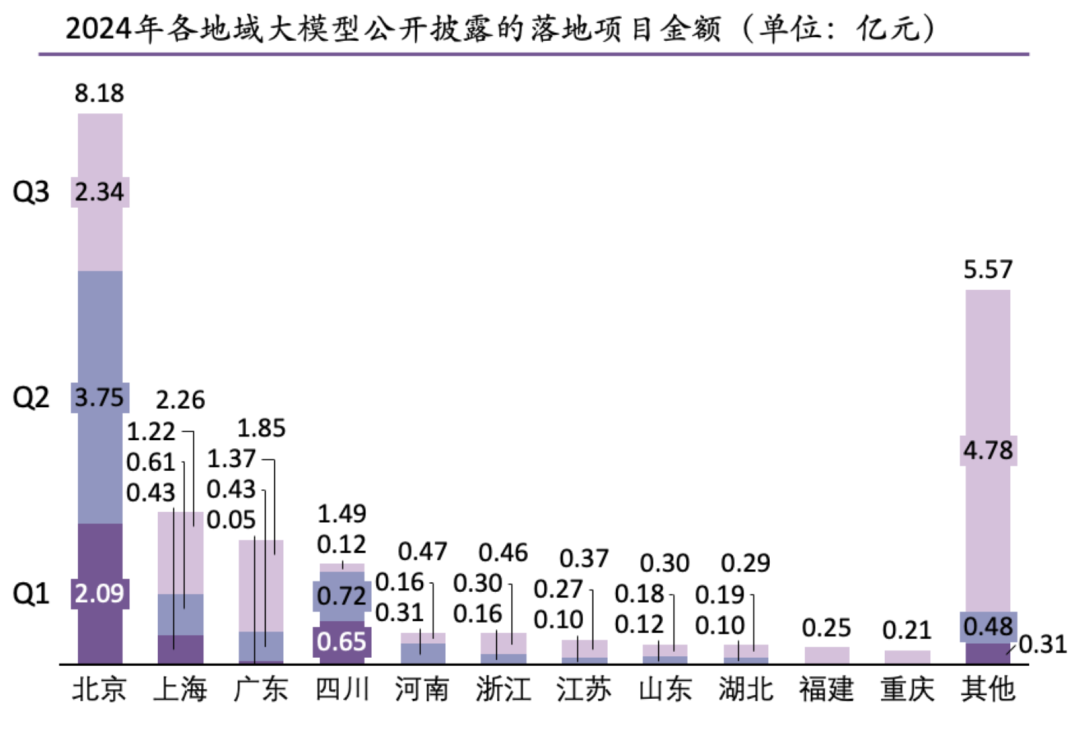 从数量上看,北京、广东(深圳)、上海、浙江、江苏等地大模型的落地数量最多,高度集中在经济发达一线城市,第二、第三季度落地数量大幅增加,有明显增长趋势。从金额上来看,落地项目高度集中在北京,头部大客户数量较多,尤其政策驱动类的政务客户在北京较为密集。北京落地节奏最快,其他地区主要在第二、三季度增长明显。