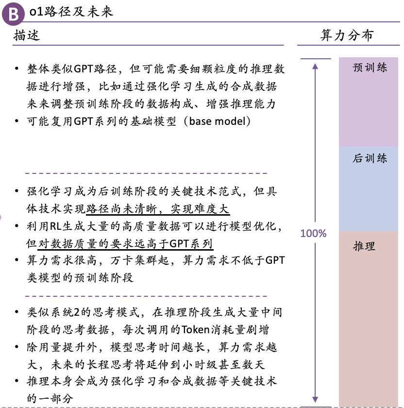 目前Scaling Law已经不仅限于GPT范式下的预训练阶段,后训练和推理成为和预训练并行的两条Scaling路线,共同推进大模型的能力提升。与此相应,未来算力分布情况也随技术范式变化出现调整,从预训练占据大部分算力变化为预训练与后训练相当,甚至在未来有超越预训练的趋势。同时o1带来的深度推理范式可能加速驱动整体推理算力超过训练算力。
