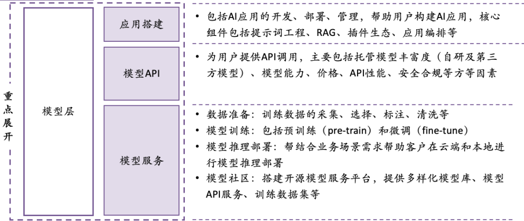 过去一年,国内不同大模型厂商在通用场景的模型能力缺乏辨识度,同时其他的细分技术方向众多,例如多模态(图像、视频生成、原生语音交互)、超长文本、深度推理、深度搜索、Agent等,单一模型厂商难以在所有场景下达到最优秀水平。因此我们认为未来更多的模型厂商将减少在通用场景的投入,更多聚焦在容易落地的垂直场景,提供相应的产品和解决方案。例如零一万物开始主推包括零售行业解决方案、模型训练解决方案、智算中心解决方案、数字人等一揽子ToB服务。