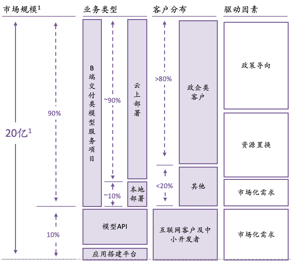 目前中国大模型行业的市场规模约20亿元,主要由B端交付类项目、模型API以及应用开发平台构成,其中B端交付类项目占据大部分市场份额且偏好云上部署,模型API和应用搭建平台的市场规模较小。从客户分布角度来看,政企类客户占据主导,主要由政策导向和资源置换等因素驱动,市场化需求较少,但我们认为未来随着市场进一步成熟,市场化需求将逐渐增加。