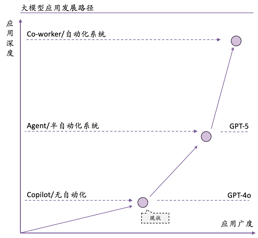 我们认为大模型已经在多个行业实现覆盖,应用广度较好,但应用深度依然受到模型能力限制。大模型未来将按照从Copolit/智能助手阶段,到Agent/半自动化阶段,再到Co-worker/自动化的方向演进,目前的大模型处于智能助手阶段,难以完成自动化任务,需要等待模型能力和产品形态的突破。