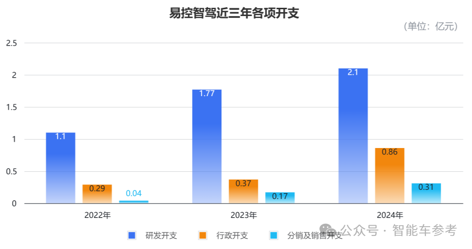 从支出来看,易控智驾对于研发的投入力度确实很大,过去三年的研发开支分别为1.1亿元、1.77亿元和2.1亿元,远超其对于行政、销售的支出。