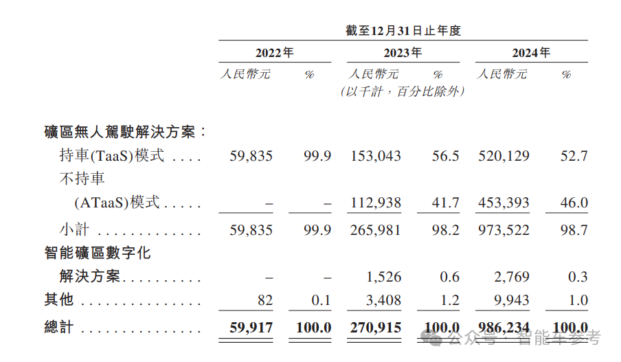 矿区无人驾驶解决方案是绝对的收入大头,在总收入中占比保持在98%以上,而智能矿区数字化解决方案从2023年开始营收,还处于早期阶段。