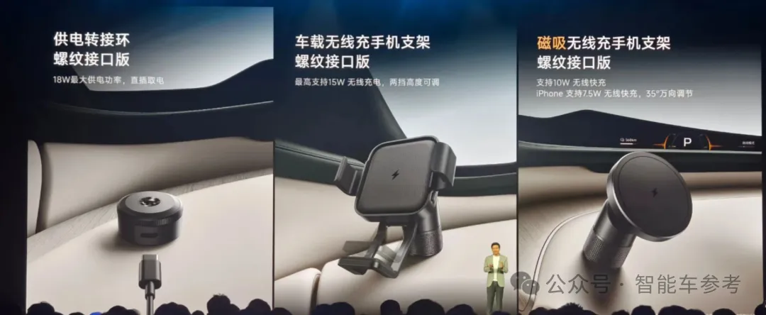 车机屏下方依然支持选装实体按键,以及旁边的螺纹接口,此次不仅支持放支架,现在还能给手机充电了,可以选装3个配件: