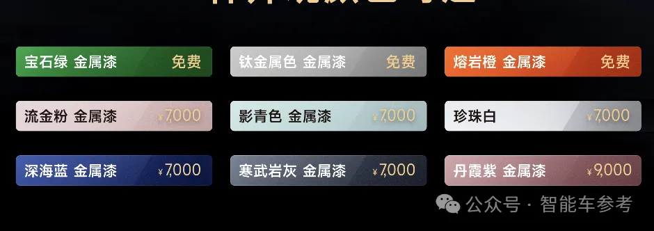 加上此前的珍珠白、流金粉(斩男粉)、钛金属、宝石绿、熔岩橙、寒武岩灰,配色高达9种,对齐了SU7上市之初的配色数: