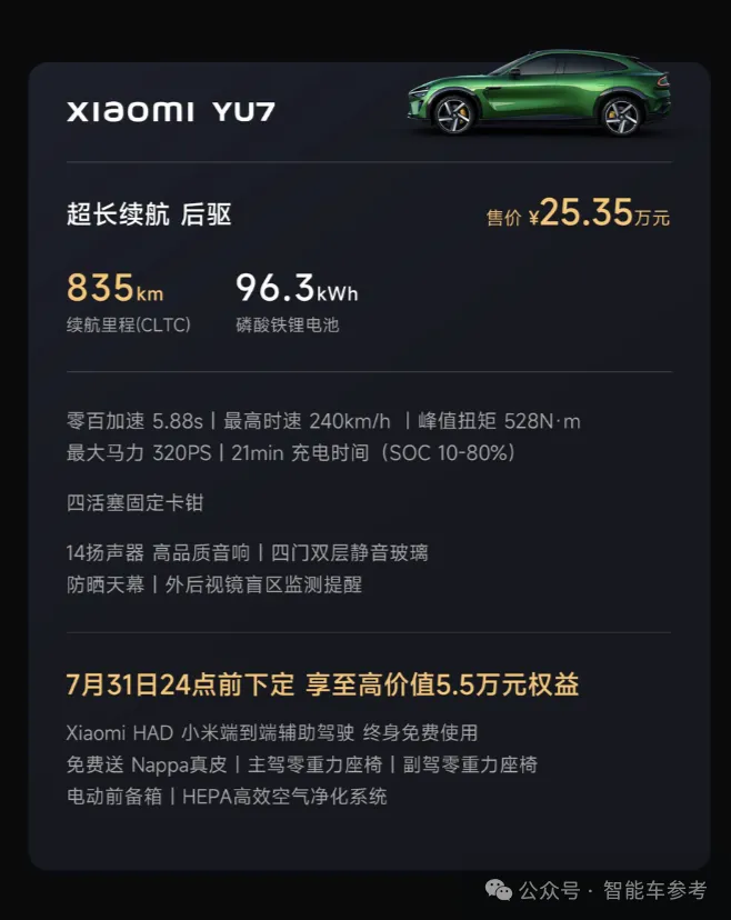 所以这样看来,YU7的标准版实际上就给到了比SU7 Pro版更高的配置,后驱单电机动力,零百加速5.88秒,搭载96.3度磷酸铁锂电池包,起步就是835km续航,售价25.35万元。