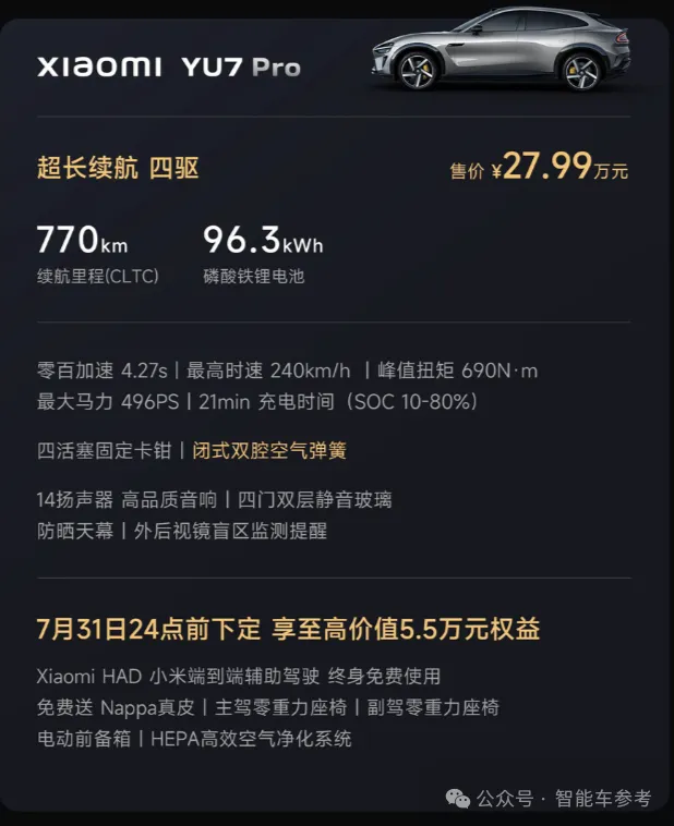 YU7的Pro版是双电机四驱,零百加速4.27秒,电池规格不变,更强的动力稍稍将续航拉低至770km,搭载闭式双腔空簧,价格为27.99万元。