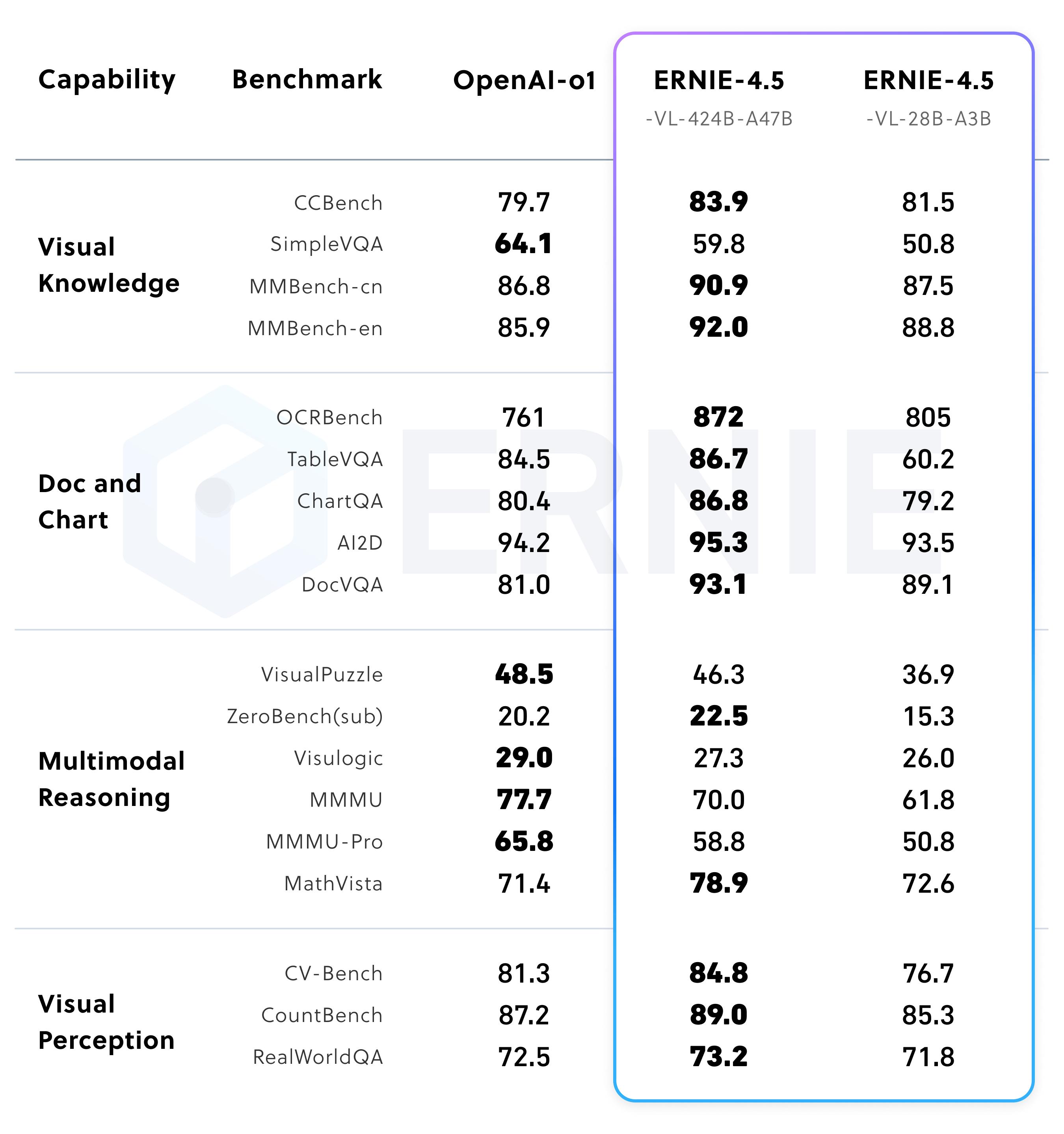 在多模态模型方面,文心大模型4.5开源系列基于强大的视觉感知能力和丰富的视觉常识,实现了思考与非思考统一,在视觉常识、多模态推理、视觉感知等主流的多模态大模型评测中优于闭源的OpenAI o1。
