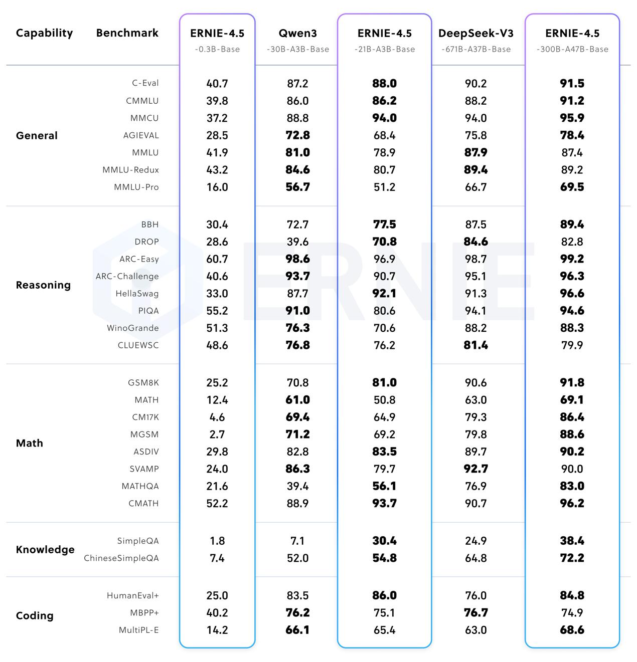 在文本模型方面,文心大模型4.5开源系列在多个主流基准评测中超越DeepSeek-V3、Qwen3等模型。