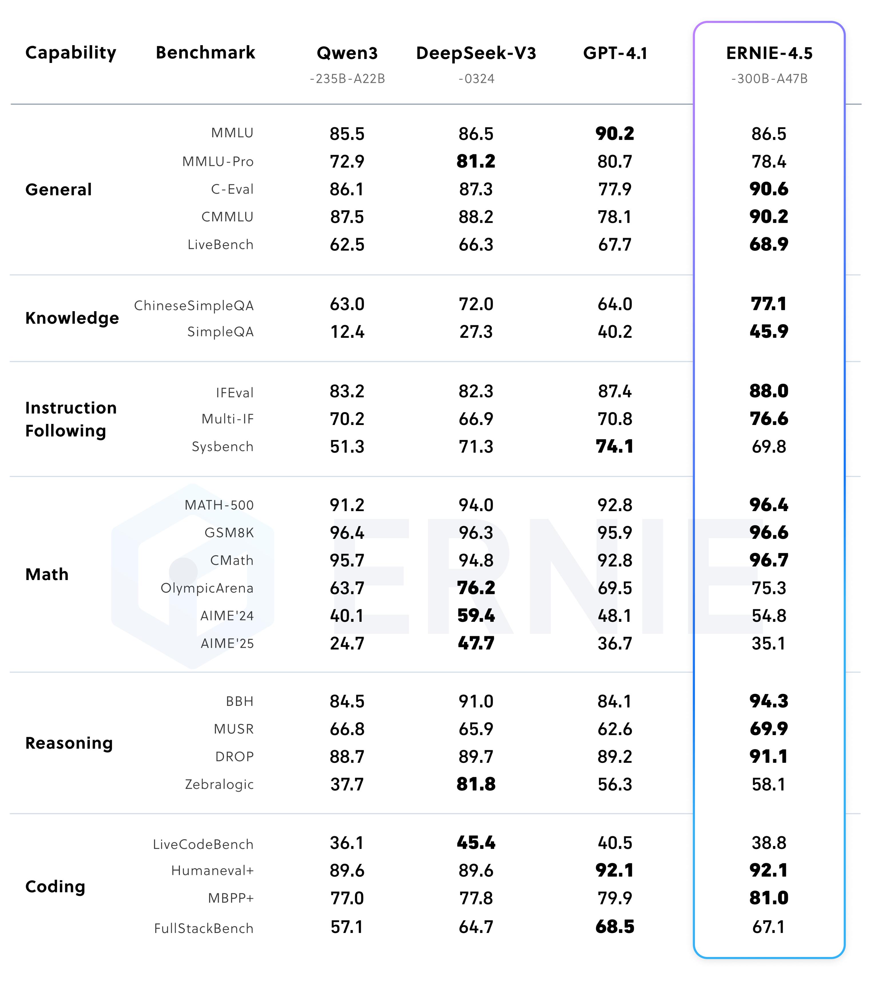 文心4.5-300B-A47B模型在主流基准测试中表现优异