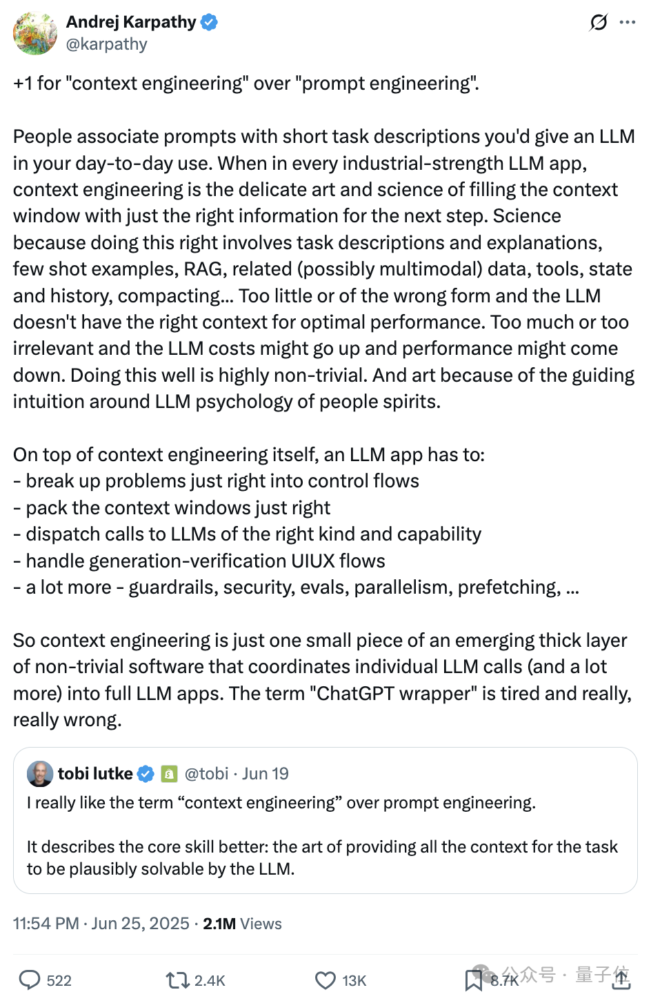 另外,还有一个新词,虽然不是Karpathy率先提出的,但得到了他的力挺,这个词就是前几天大火的——上下文工程(Context Engineering)。