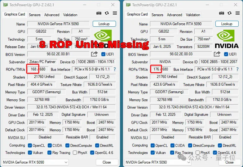 第二起比较著名的翻车事件,是缺少ROPs(光栅化处理单元),涉及5090、5090D、5070 Ti等型号。