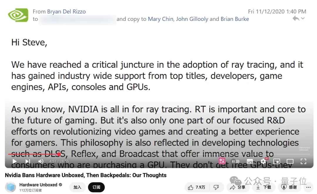 当时,英伟达高级公关经理Bryan Del Rizzo曾发邮件给Hardware Unboxed,表示其评测“未能达到预期”,因为他们只关注光栅化性能,而“大大折扣”了英伟达提供的其他技术(如DLSS、Reflex等)。