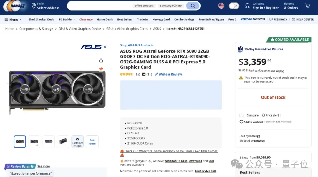 例如在美国知名电商NewEgg上,建议零售价1999美元的华硕版5090卖到了3359.99美元,而且还没货,有货的第三方卖家最低要价5100美元(约3.6万人民币),比建议售价足足翻了2.5倍多。