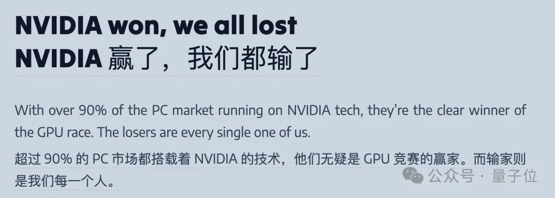 列举完英伟达的种种罪状之后,作者直言“英伟达赢了,我们都输了”。