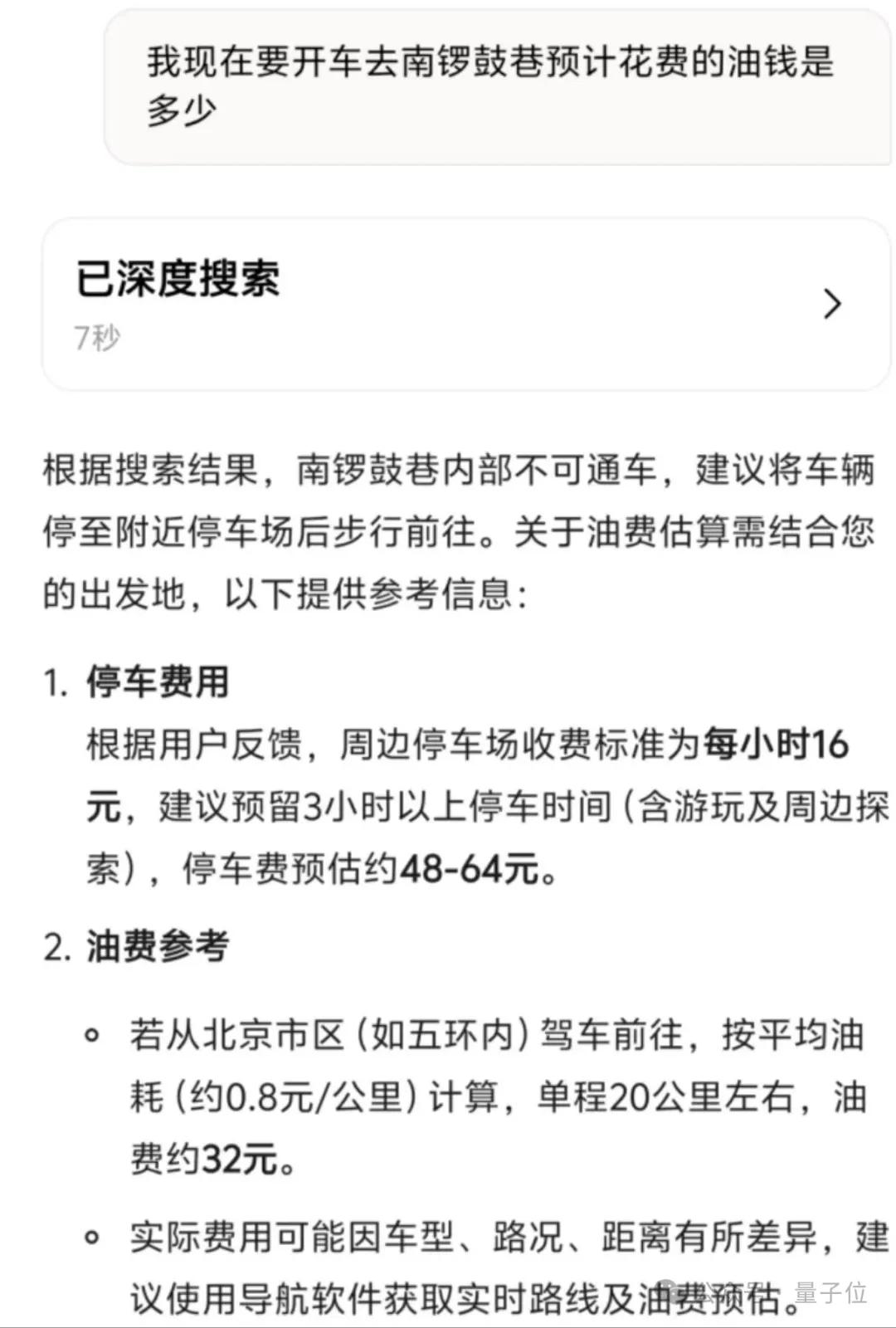 不想跨城出远门,就想在城里转转,就问它当地的景点,以北京的南锣鼓巷为例,它还会贴心地补充没问到的费用。