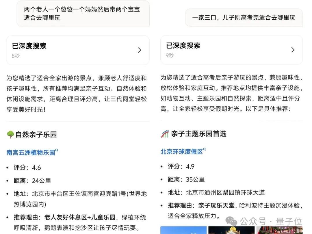 还可以告诉他出行的人数、人员构成,比如先后输入祖孙三代和三口之家,推荐的游玩地点也明显不同。