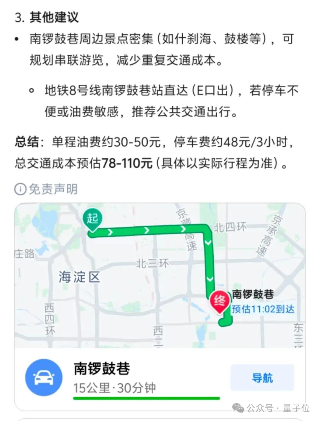 比如小高老师推荐咱去北京动物园,直接点击输出的对应结果,一键就能开始导航,行程前到行程中无缝衔接,非常丝滑。