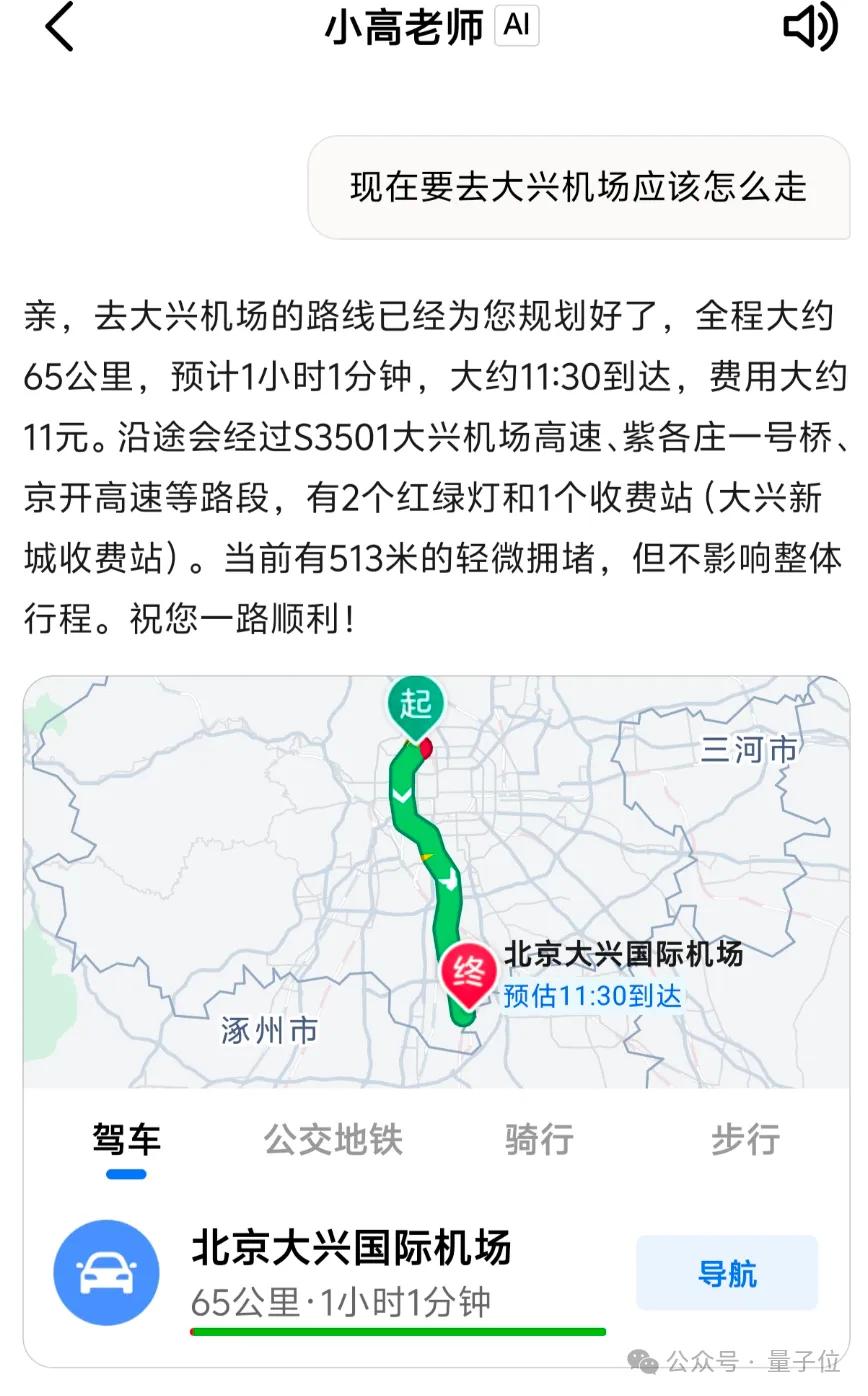 你跟它沟通,输入的是语音或文字等多模态信息,小高老师不仅会以语音文字回复你,更方便的是,它会直接在对话栏里给出目的地路程规划信息,一路上需要途径哪条路、哪个加油站或者咖啡店,到达目的地预估时长、路上有几个红绿灯,是否堵车,都会贴心地告诉你。