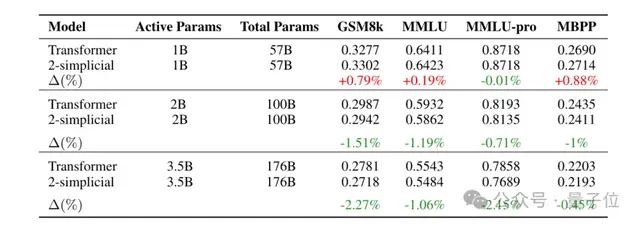 可以看到,在小模型(1B)上,2-Simplicial Transformer改进有限,在GSM8k、MBPP等任务中甚至出现了较为明显的性能下降。